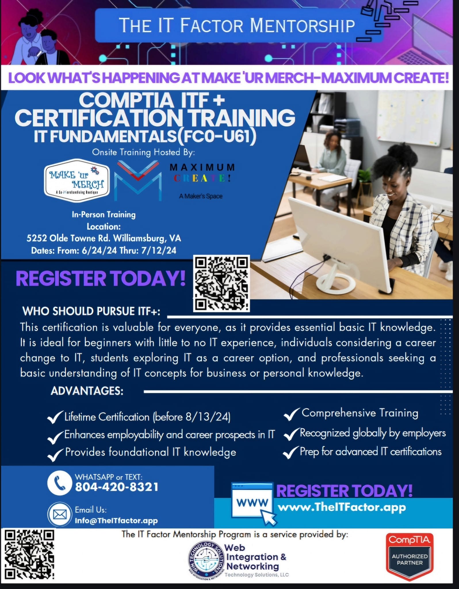 Register today for CompTIA ITF+ Certification Training IT Fundamentals (FC0-U61) onsite training hosted by Make'ur Merch and Maximum Create. This certification course is valuable for everyone, as it provides essential basic IT knowledge. It is ideal for beginners with little to no IT experience, individuals considering a career change to IT, students exploring IT as a career option, and professional seeking a basic understanding of IT for business or personal knowledge.