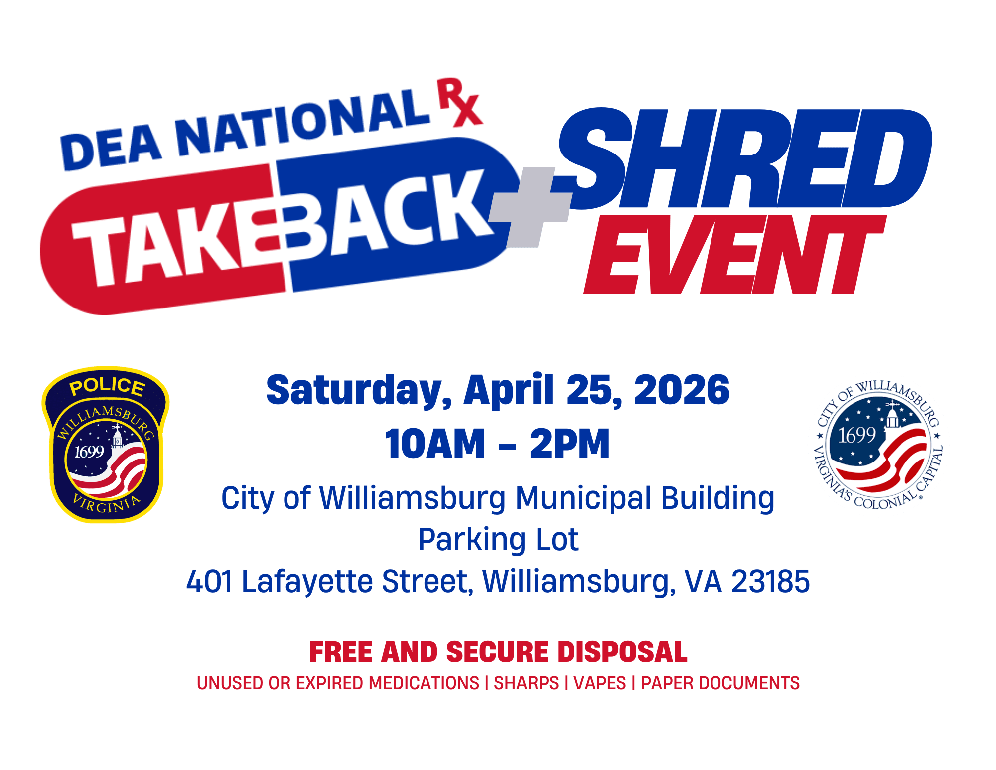 On Saturday, April 25th, from 10 AM to 2 PM, we’re hosting a dual event in the parking lot of the Williamsburg Municipal Building (401 Lafayette Street). Swing by our Drug Take Back drive-thru to safely dispose of any unused or expired medications, including controlled substances. Your contributions will be securely destroyed. Plus, bring your paper documents for secure shredding at our on-site Shred-It event. This is your chance to support both community health and data protection.