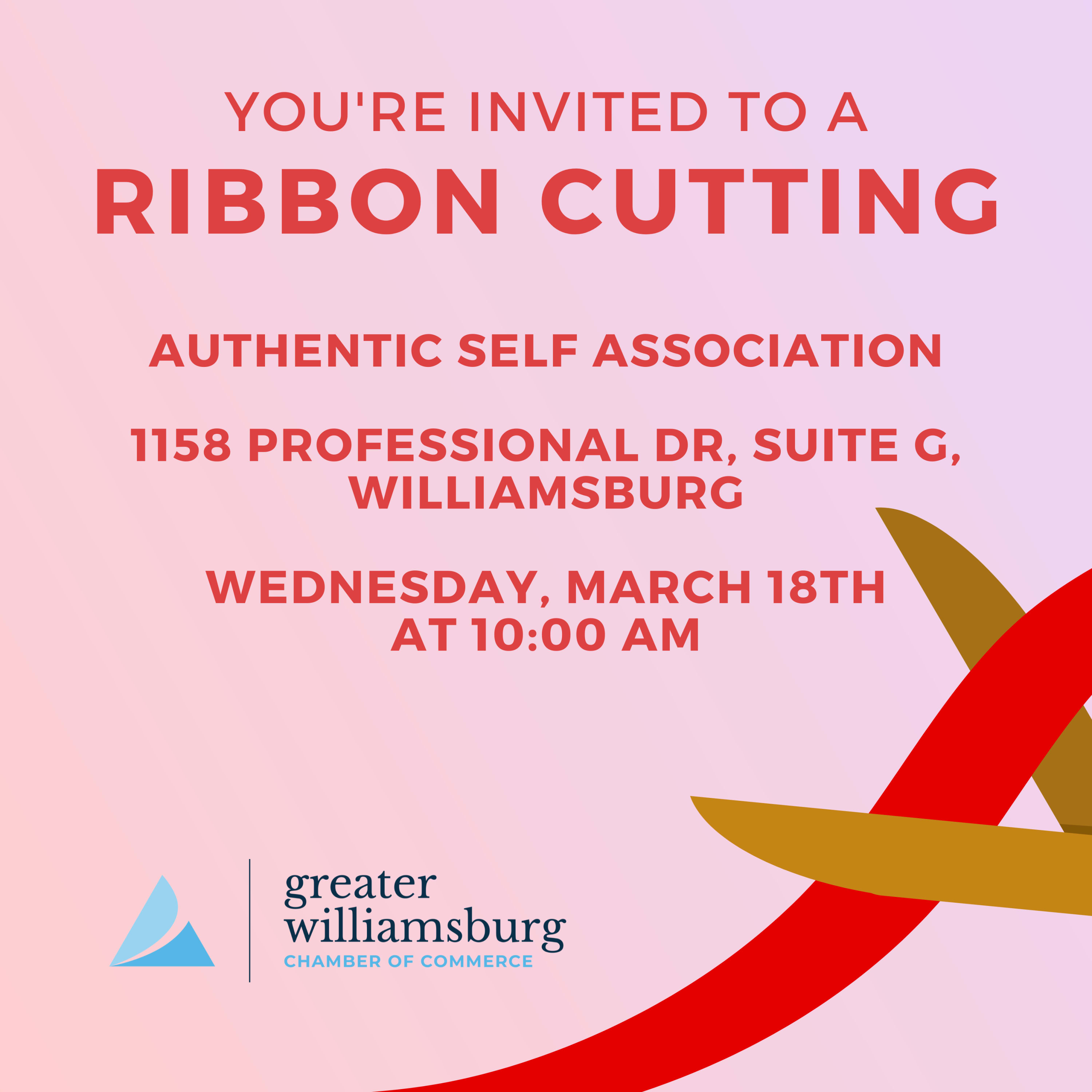 Join the Greater Williamsburg Chamber of Commerce for a Ribbon Cutting at Authentic Self Association to celebrate its first anniversary on Wednesday, March 18, 2026, at 10:00 AM. The address is 1158 Professional Dr, Suite G, Williamsburg, Virginia 23185.