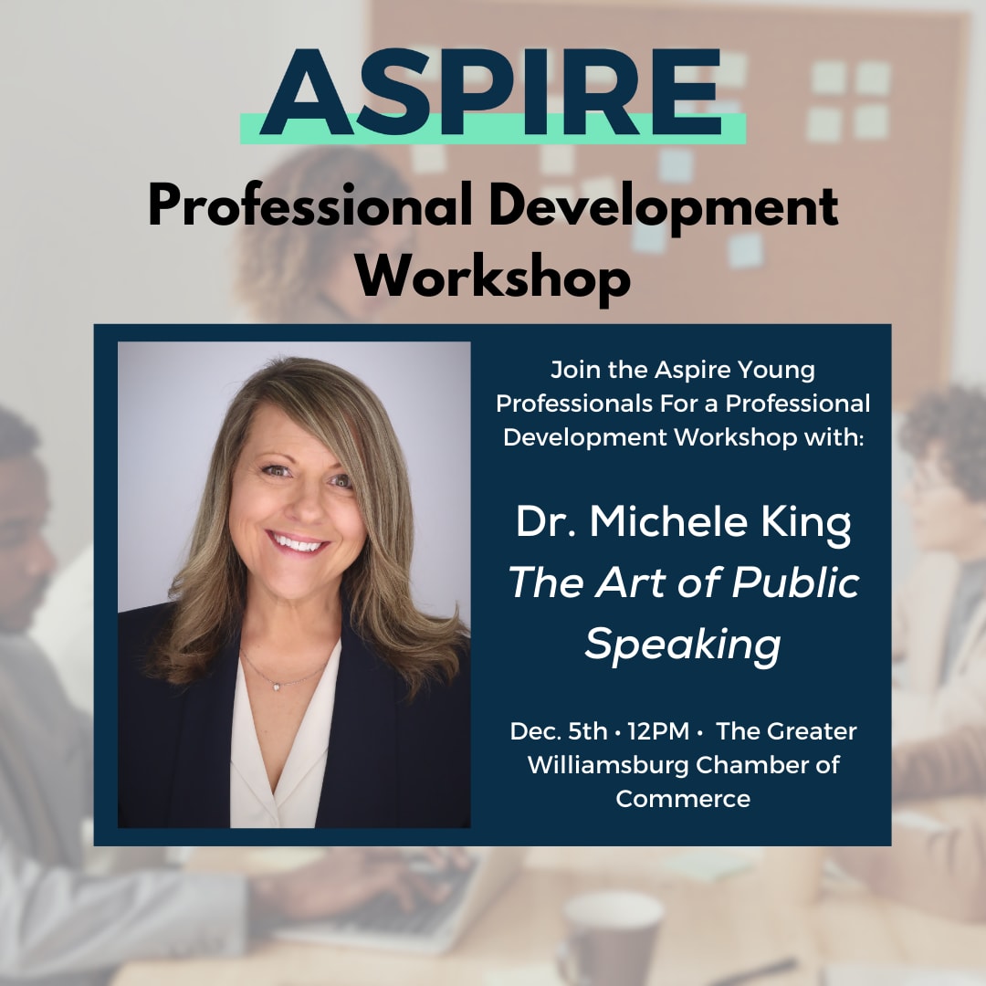Join the ASPIRE Young Professionals for a Professional Development Workshop on Thursday, December 5th at 12 PM! The workshop is presented by The Greater Williamsburg Chamber of Commerce, and it will take place in the Chamber of Commerce Conference Room.
