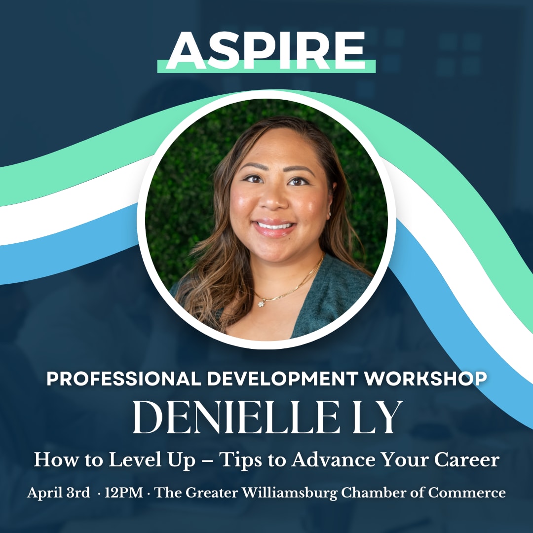 Join the ASPIRE Young Professionals for a Professional Development Workshop on Thursday, April 3rd at 12 PM! The workshop is presented by The Greater Williamsburg Chamber of Commerce, and it will take place in the Chamber of Commerce Conference Room.