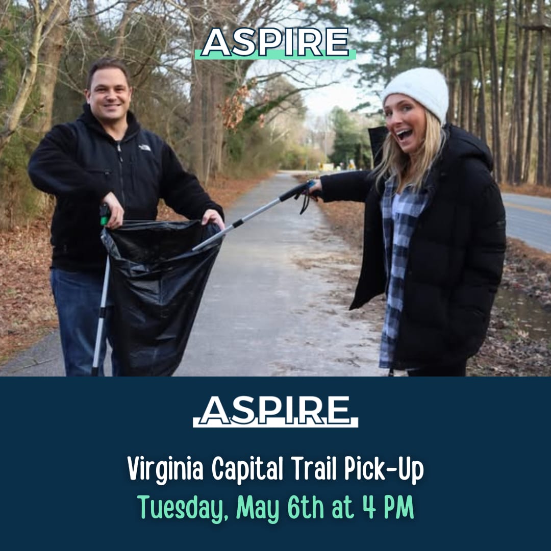 Grab your walking shoes and join the ASPIRE Young Professionals for a Trash Pick-Up on the Virginia Capital Trail! The group will be gathering on May 6th at 4PM, meeting at the Trailhead on Jamestown Road. Pick-up supplies will be provided.