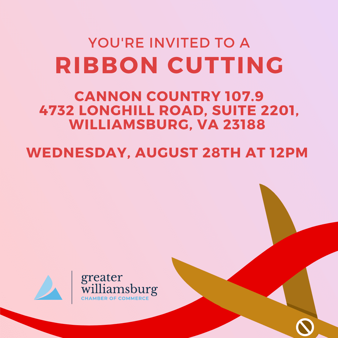 Join the Greater Williamsburg Chamber of Commerce for a Ribbon Cutting Ceremony at Cannon Country 107.9. Cannon Country 107.9 will be celebrating their grand opening with a ribbon cutting on Wednesday, August 28th at 12pm at 4732 Longhill Road, Suite 2201, Williamsburg, VA 23188.