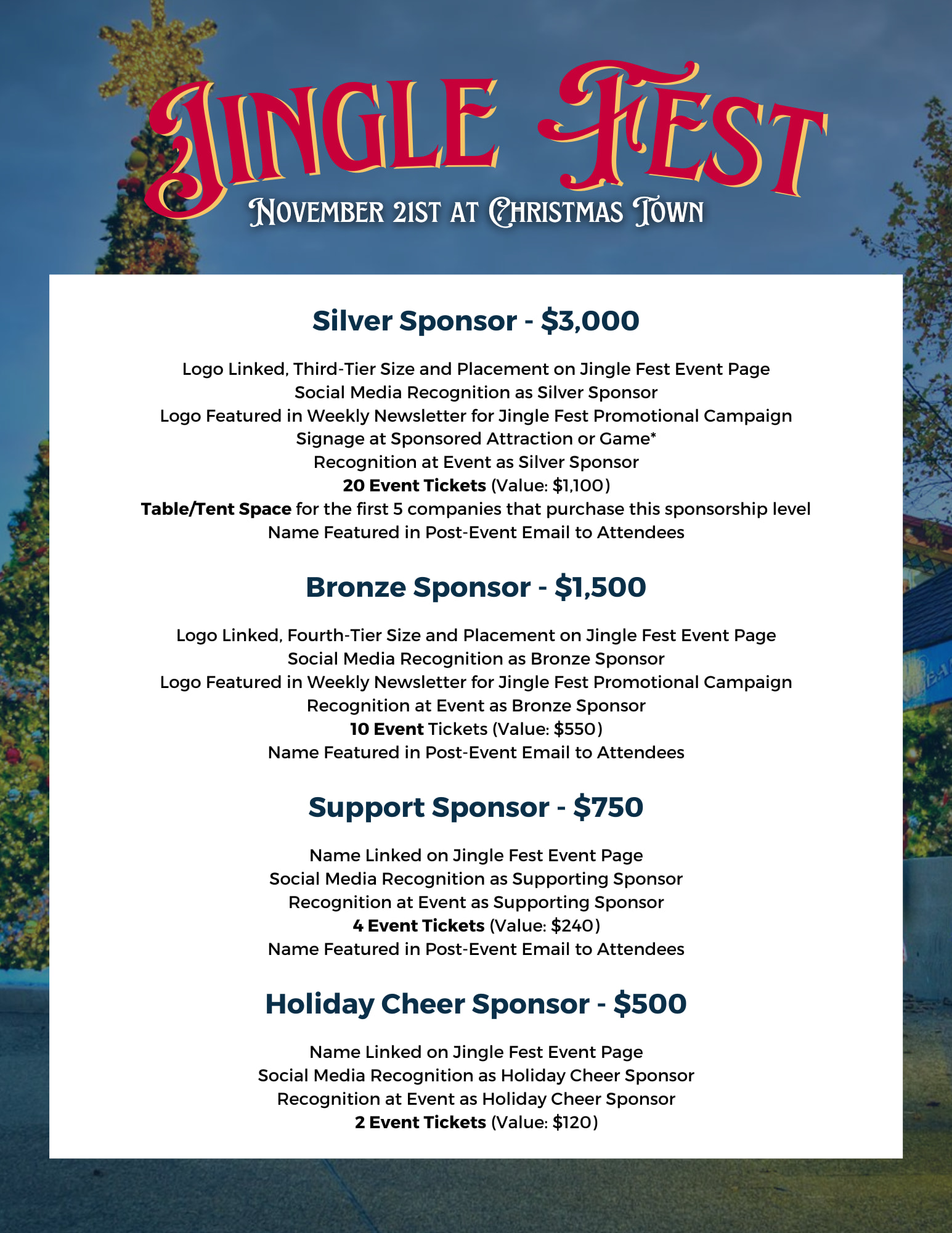 Maximize your company’s visibility and engagement at Jingle Fest by becoming a sponsor! Various sponsorship packages are available to suit every organization’s needs, including opportunities for branding, reserved spaces, and exclusive event access. Click here to explore our sponsorship opportunities and secure your spot today!