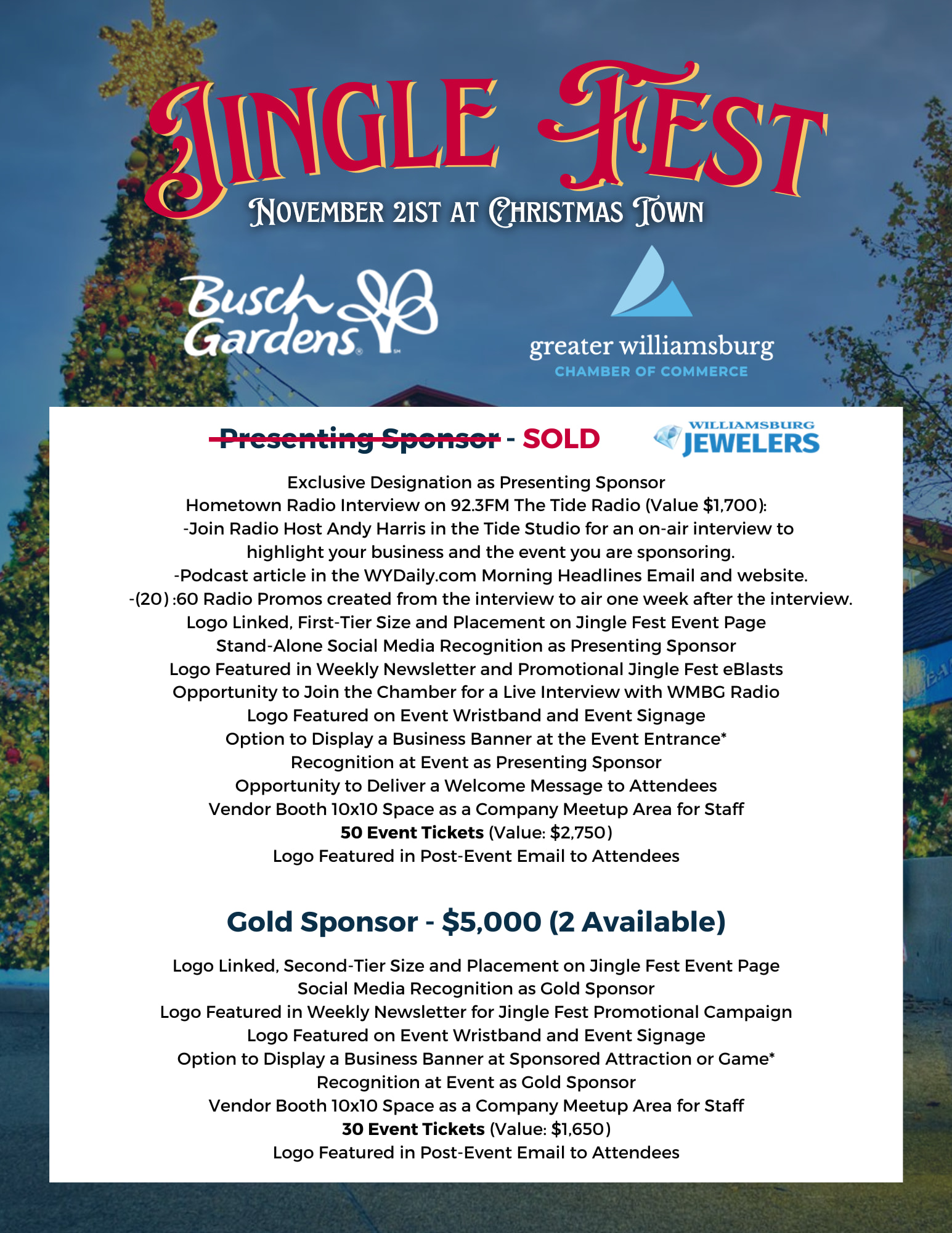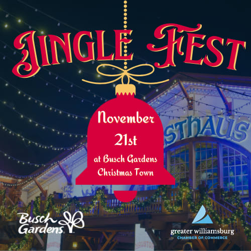 Don't miss out on this exclusive holiday event! Purchase your tickets and secure your sponsorship today to ensure your place at Jingle Fest. Celebrate the season in style with the Greater Williamsburg Chamber of Commerce at Busch Gardens Christmas Town!