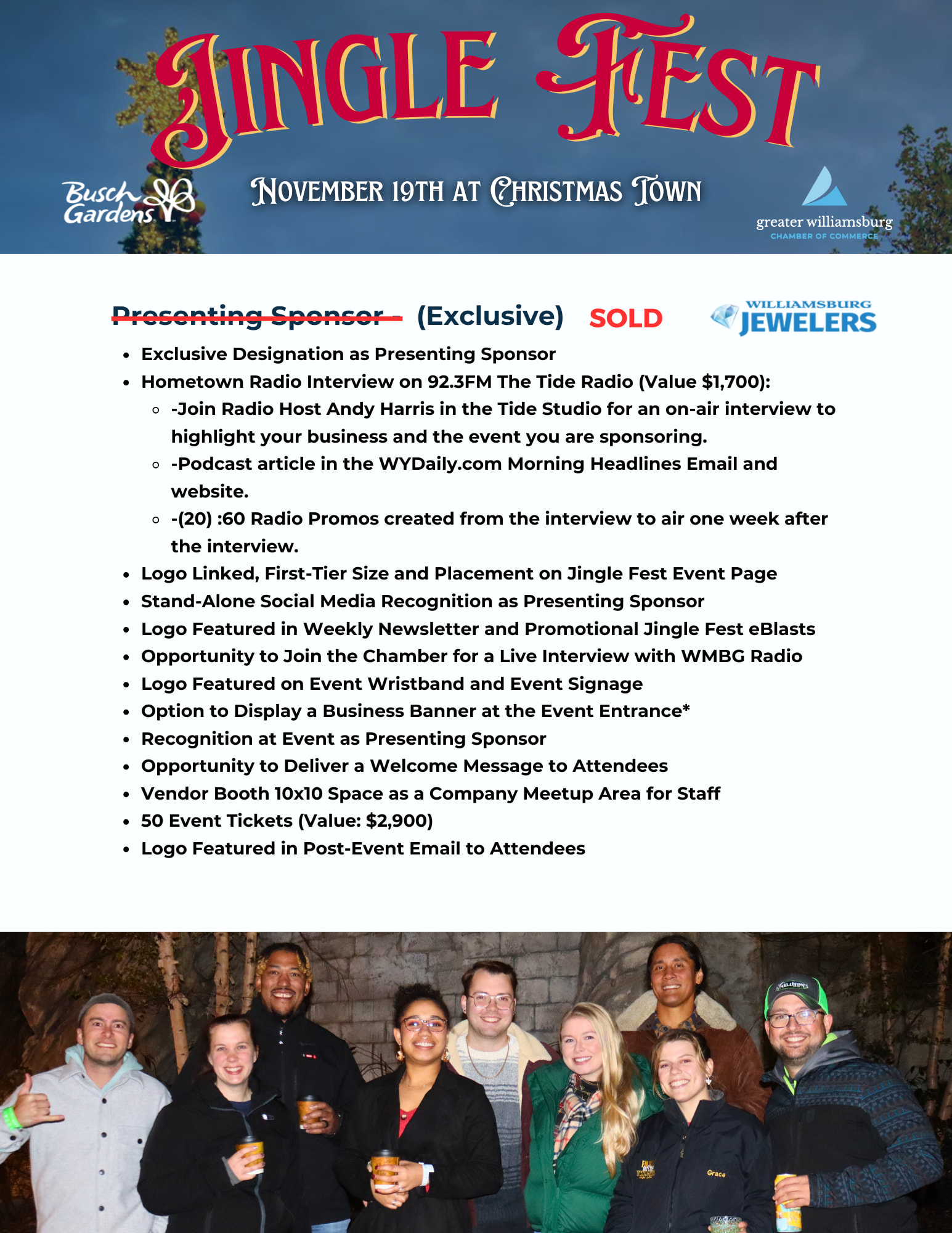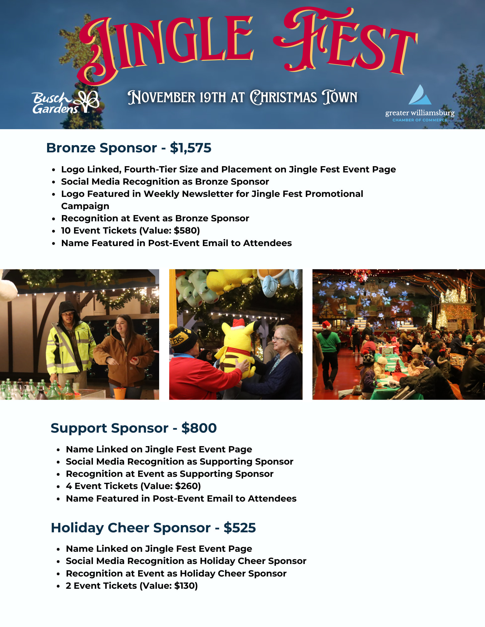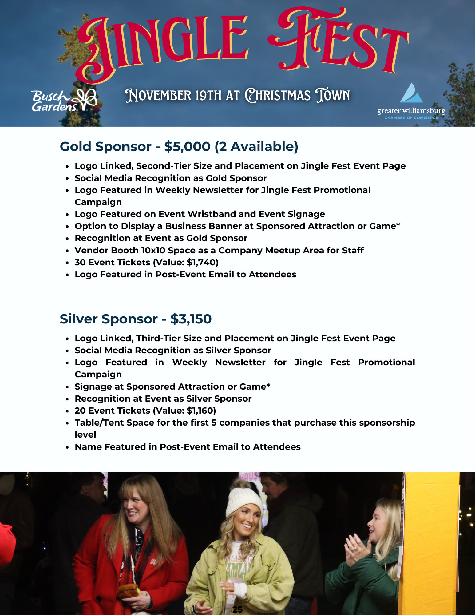 Maximize your company’s visibility and engagement at Jingle Fest by becoming a sponsor! Sponsorship is a fantastic way to support the community while giving your business a significant platform. We have a variety of sponsorship levels available to fit every budget and marketing goal.