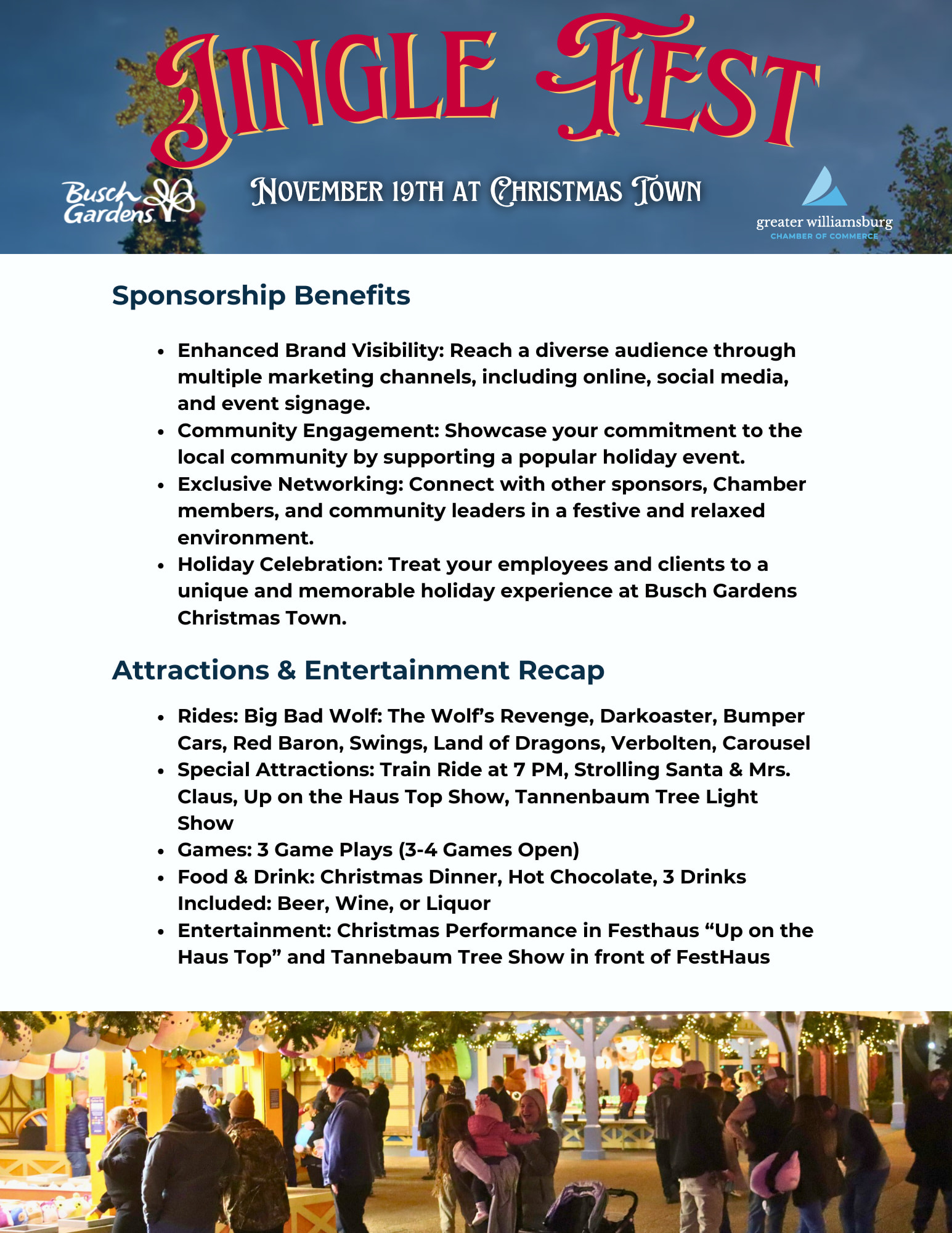 Get ready to unwrap the magic of the season! Last year's inaugural Jingle Fest, presented by Williamsburg Jewelers, sold out, and this year, we're ready to create more holiday magic than ever before. Join us for a private, exclusive holiday celebration at Busch Gardens Christmas Town. Jingle Fest is the perfect way for your company to celebrate a successful year, reward your team, and make unforgettable memories.