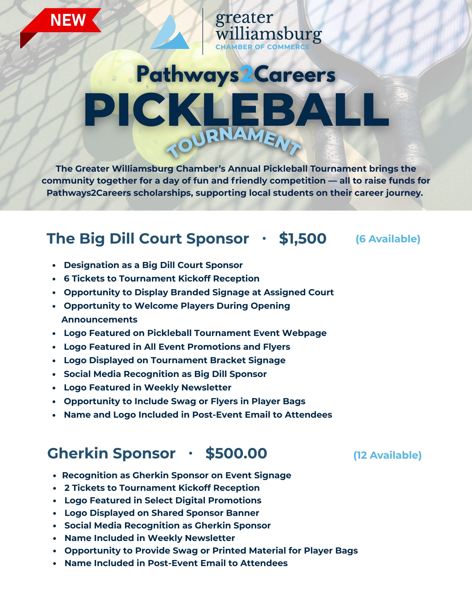 Get ready to rally for a remarkable cause! The Greater Williamsburg Chamber of Commerce invites you to participate in our inaugural Pickleball Tournament for Education—a day of friendly competition and powerful community support. Proceeds from this brand-new tournament will fuel the Pathways2Careers program and scholarships, helping local high school students pursue their college or trade school dreams.