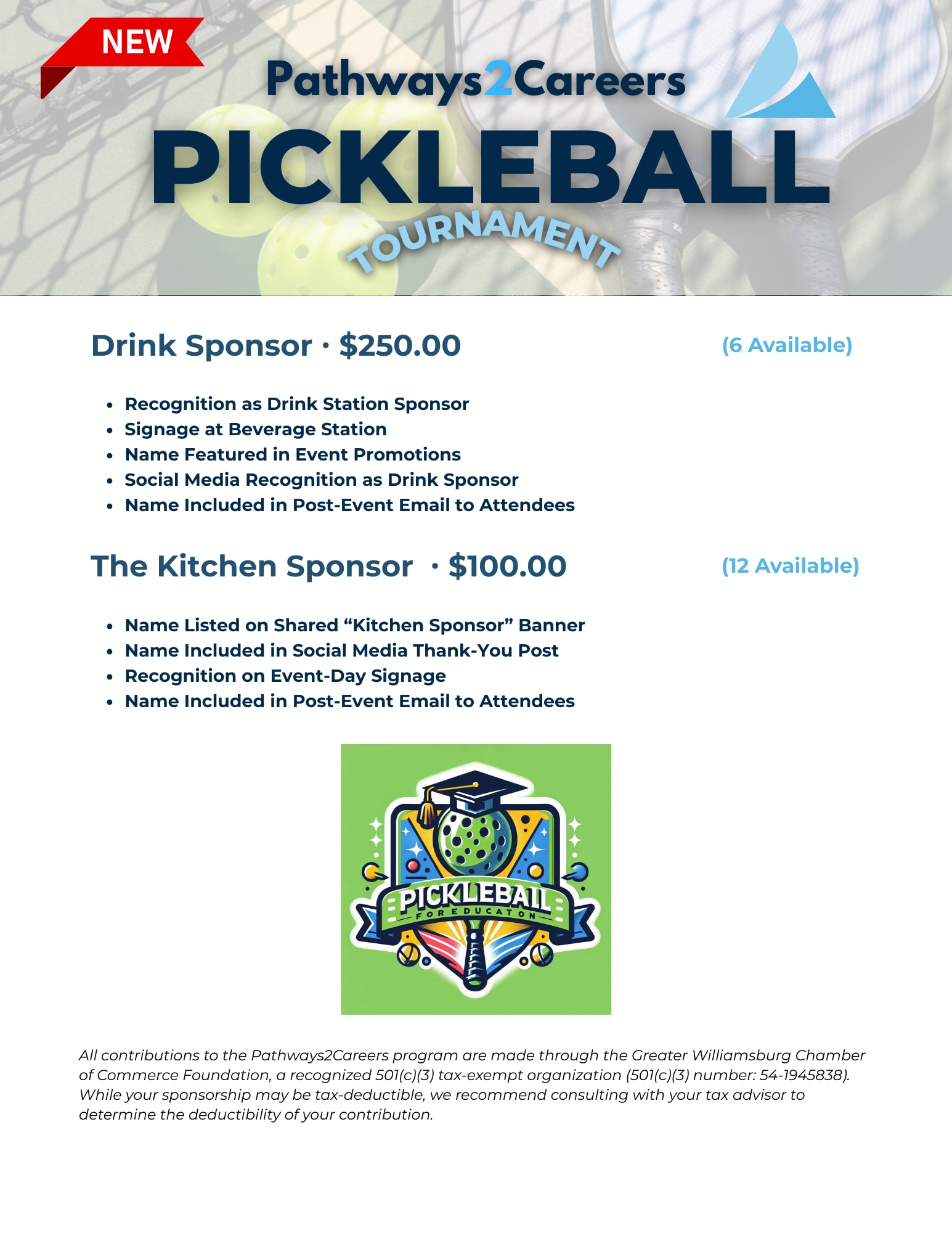 Every paddle swing helps expand the Pathways2Careers program and scholarship fund. This program provides invaluable connections and career support for 9th-12th grade students and recent graduates across Greater Williamsburg, offering financial assistance for their higher education journey. Play pickleball, invest in a future!