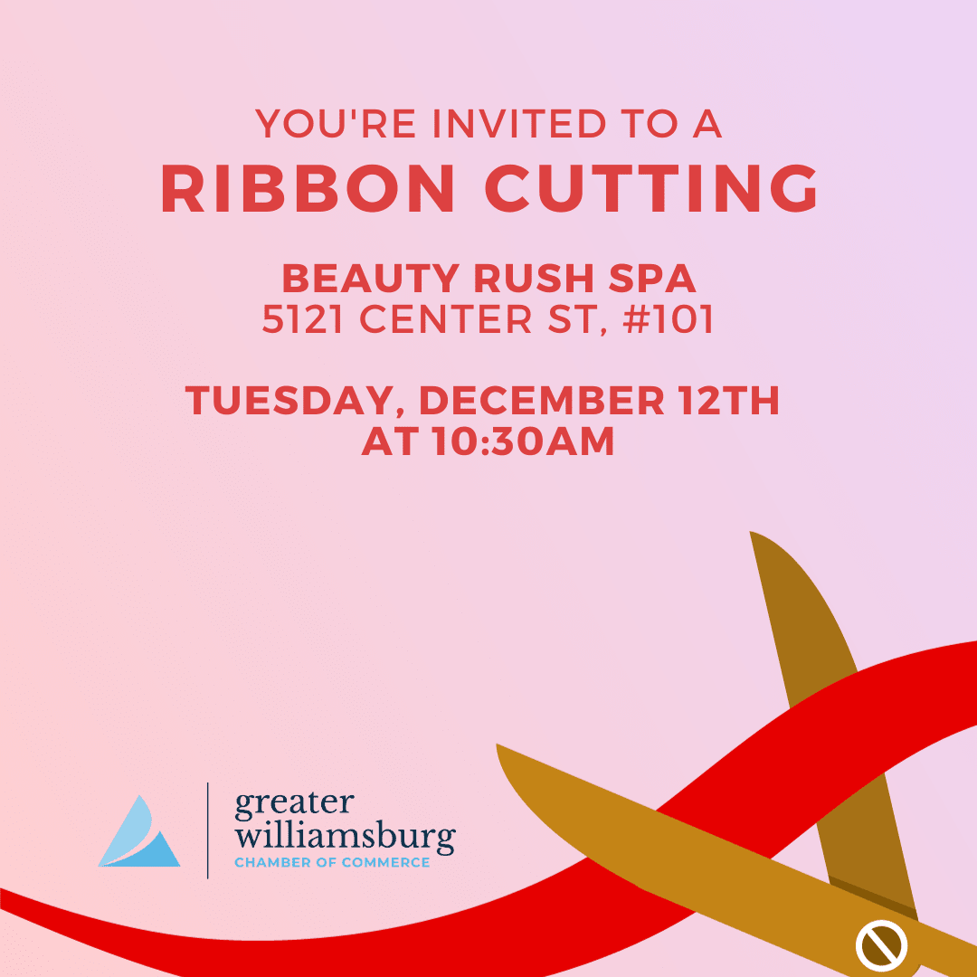 Join the Greater Williamsburg Chamber of Commerce for a Ribbon Cutting Ceremony for Beauty Rush Spa on Tuesday, December 12th at 10:30AM. The Ceremony will take place at 5121 Center Street, #101, Williamsburg, VA 23188.