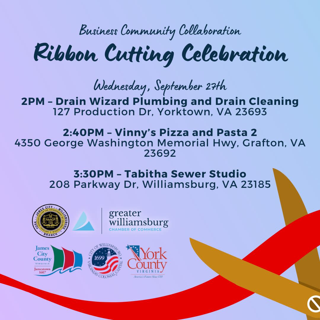 Join the Greater Williamsburg Chamber of Commerce, York-James City-Williamsburg NAACP, James City County, York County, and the City of Williamsburg for a Business Community Collaboration Ribbon Cutting Celebration on Wednesday, September 27th. We will travel along the following route:
