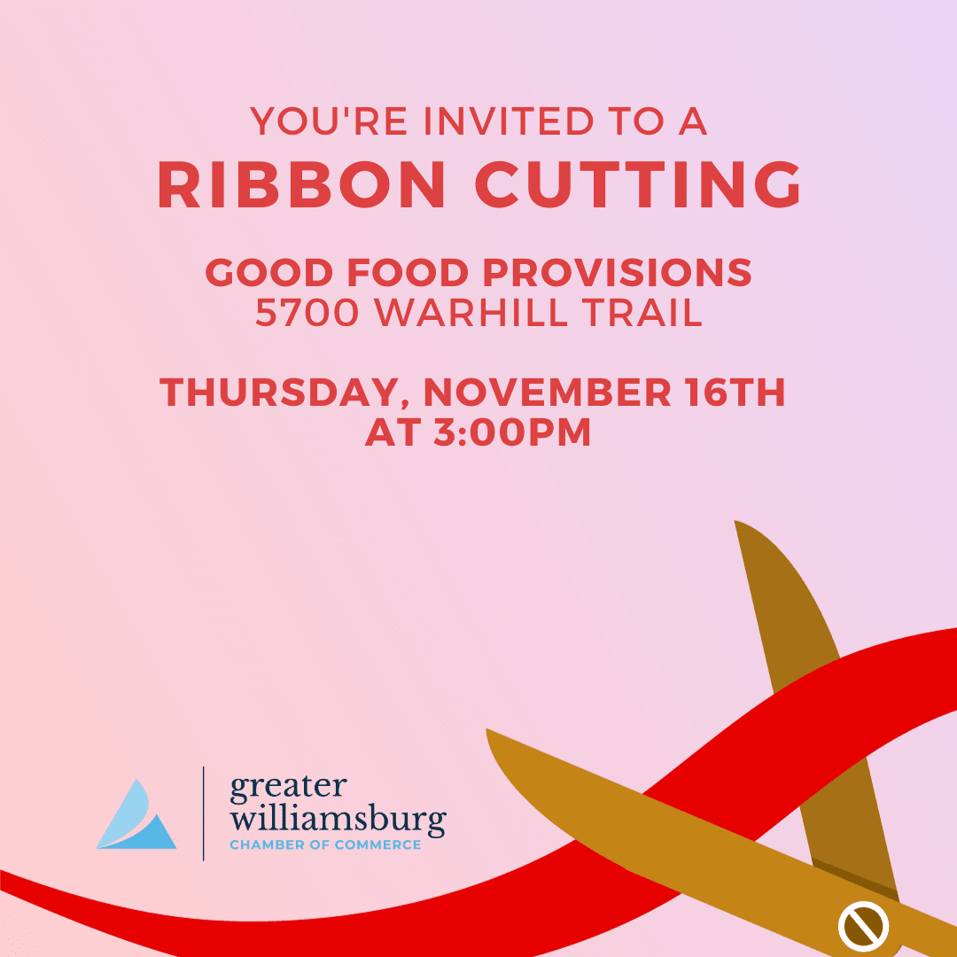 Join the Greater Williamsburg Chamber of Commerce for a Ribbon Cutting Ceremony for Good Food Provisions on Thursday, November 16th at 3:00PM. The Ceremony will take place at 5700 Warhill Trail, Williamsburg, VA 23185.