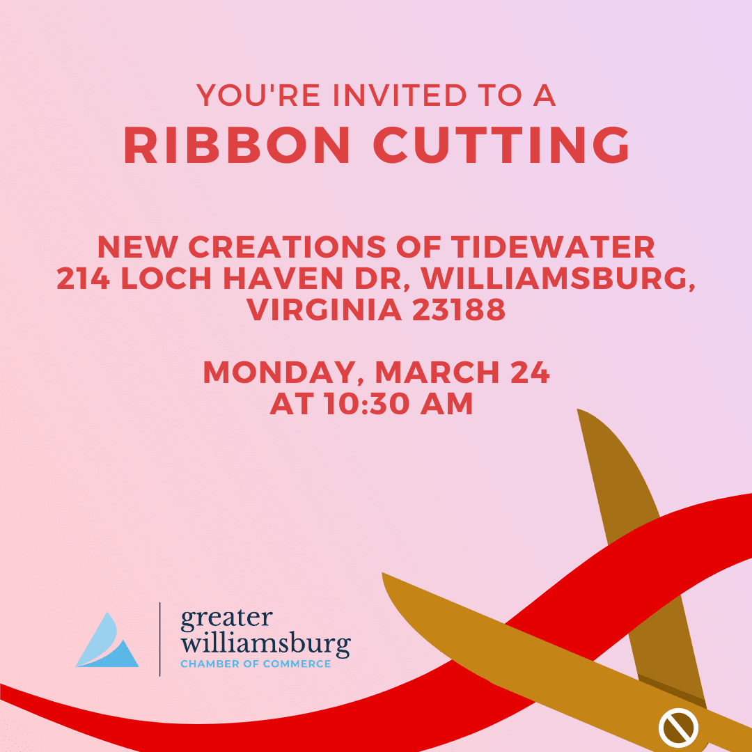 Join the Greater Williamsburg Chamber of Commerce for a Ribbon Cutting Ceremony at New Creations of Tidewater to celebrate its grand opening with a ribbon cutting on Monday, March 24th at 4:00 PM. The address is 214 Loch Haven Dr, Williamsburg, Virginia 23188.
