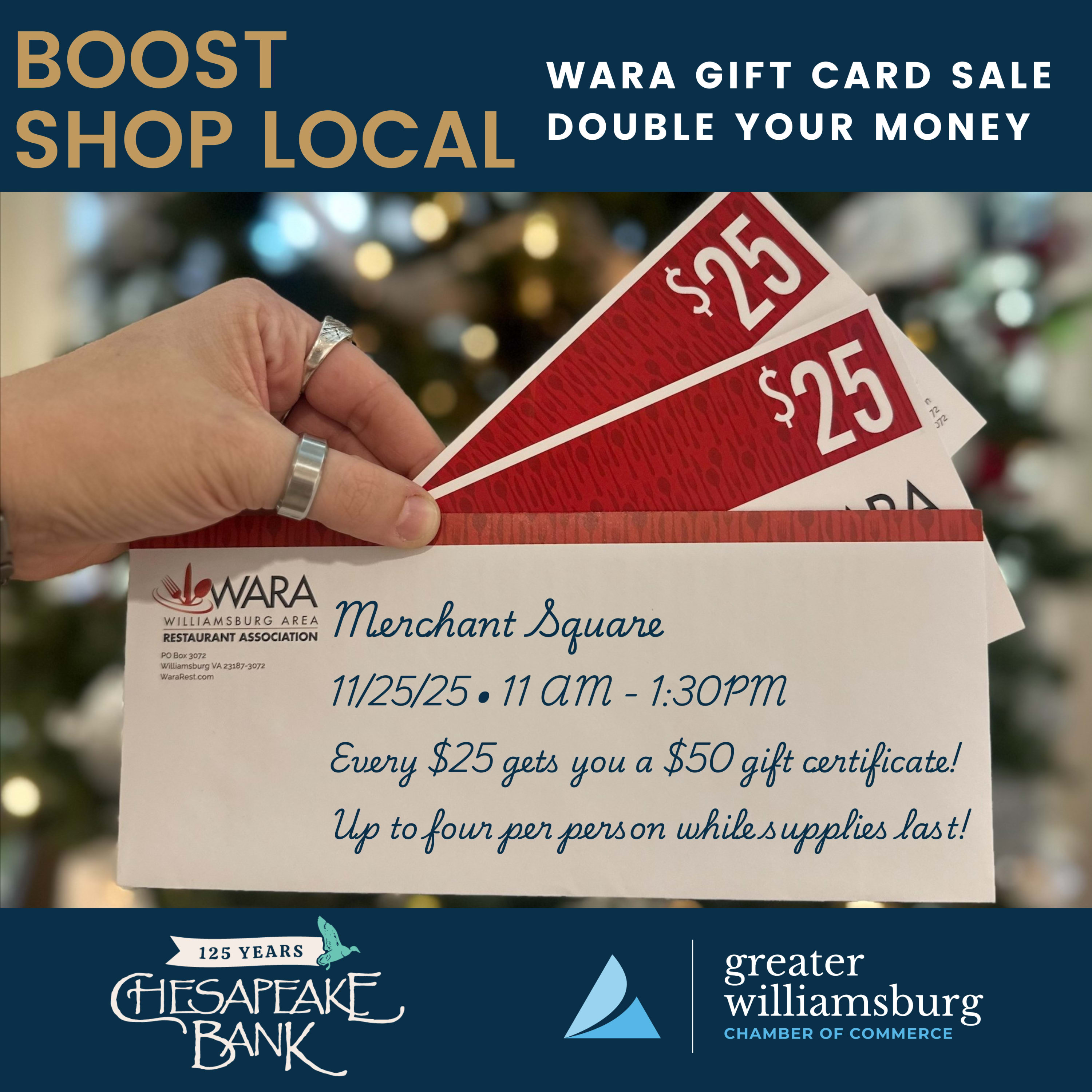 Buy or Williamsburg Area Restaurant Association gift cards for only $25.00. VISAs WILL NOT BE SOLD AT ANY EVENT.