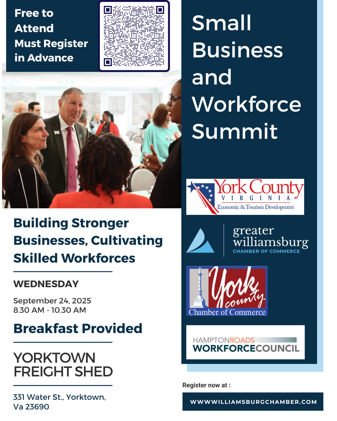 Expert Insights: Hear brief, impactful presentations from our host organizations – the Greater Williamsburg Chamber & Commerce, York County Economic Development & Tourism, the Hampton Roads Workforce Council, and the York County Chamber of Commerce – offering valuable perspectives on business growth and workforce solutions. You'll also hear from SCORE Mentors and the Hampton Roads Small Business Development Center.