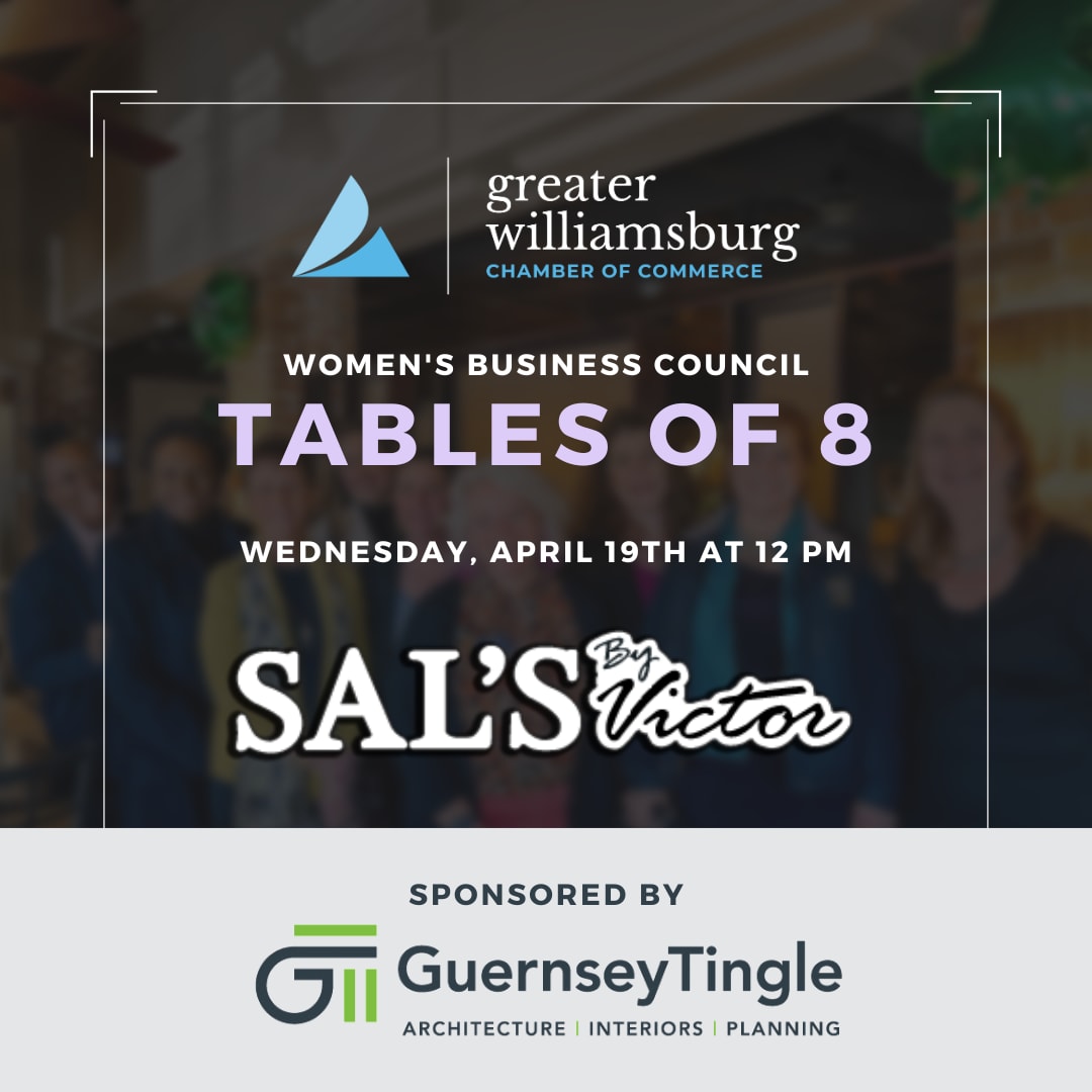 The next Women's Business Council Tables of 8 Lunch sponsored by GuernseyTingle will be Wednesday, April 19th from 12 PM to 1:30 PM. The group will gather at Sal's by Victor for networking, a facilitated topic of the month, and lunch. There is no cost to reserve your seat—simply be prepared to cover the cost of your lunch at the event.