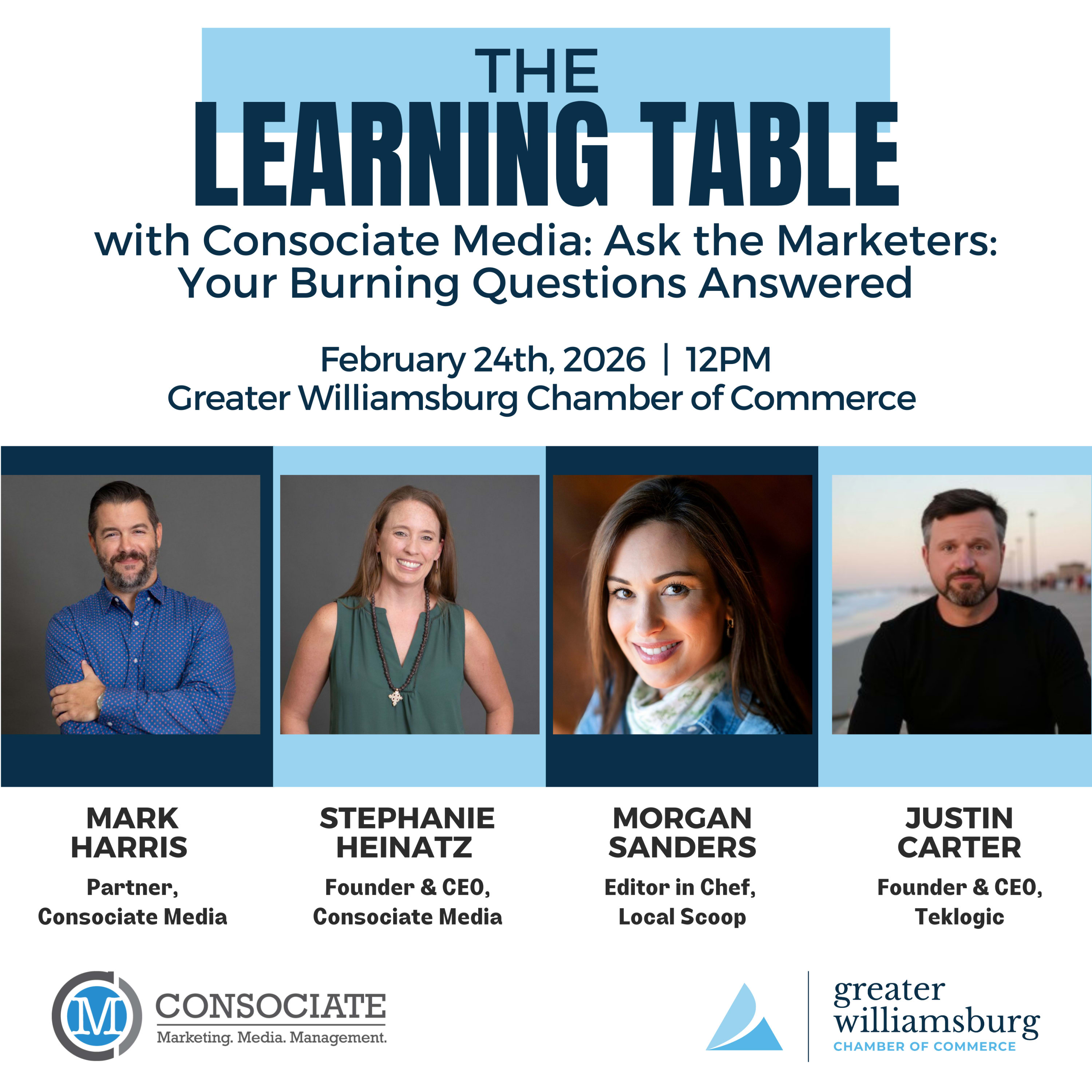 Join the Greater Williamsburg Chamber of Commerce, in partnership with Consociate Media for a special Learning Table Panel. "Come Ask the Marketers," your burning questions, and gain insights from local experts!
