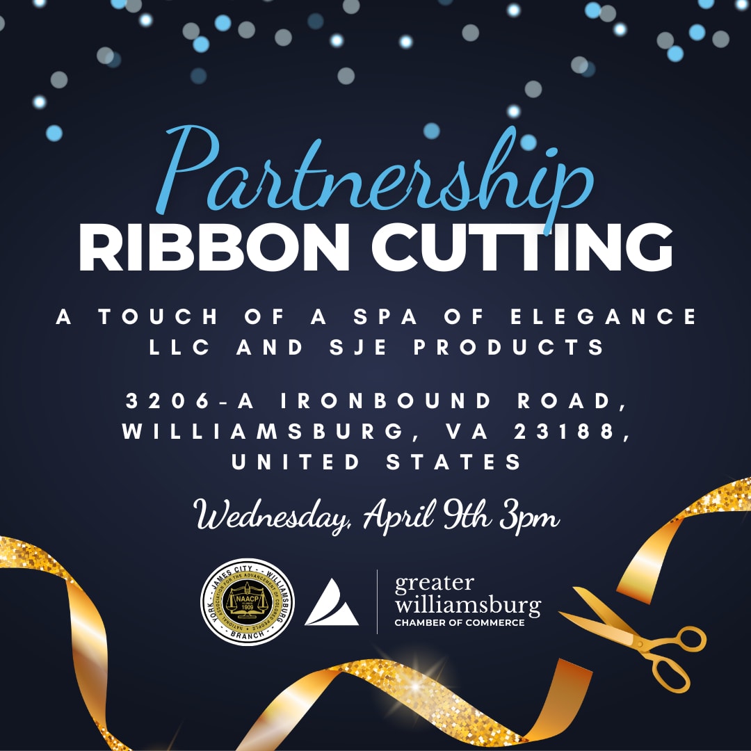 Join the Greater Williamsburg Chamber of Commerce, York-James City-Williamsburg NAACP, and James City County for a Partnership Ribbon Cutting for the grand opening of A Touch of A Spa of Elegance LLC and SJE PRODUCTS on Wednesday, April 9th at 3 PM, 3206-A Ironbound Road, James City County, VA 23188.